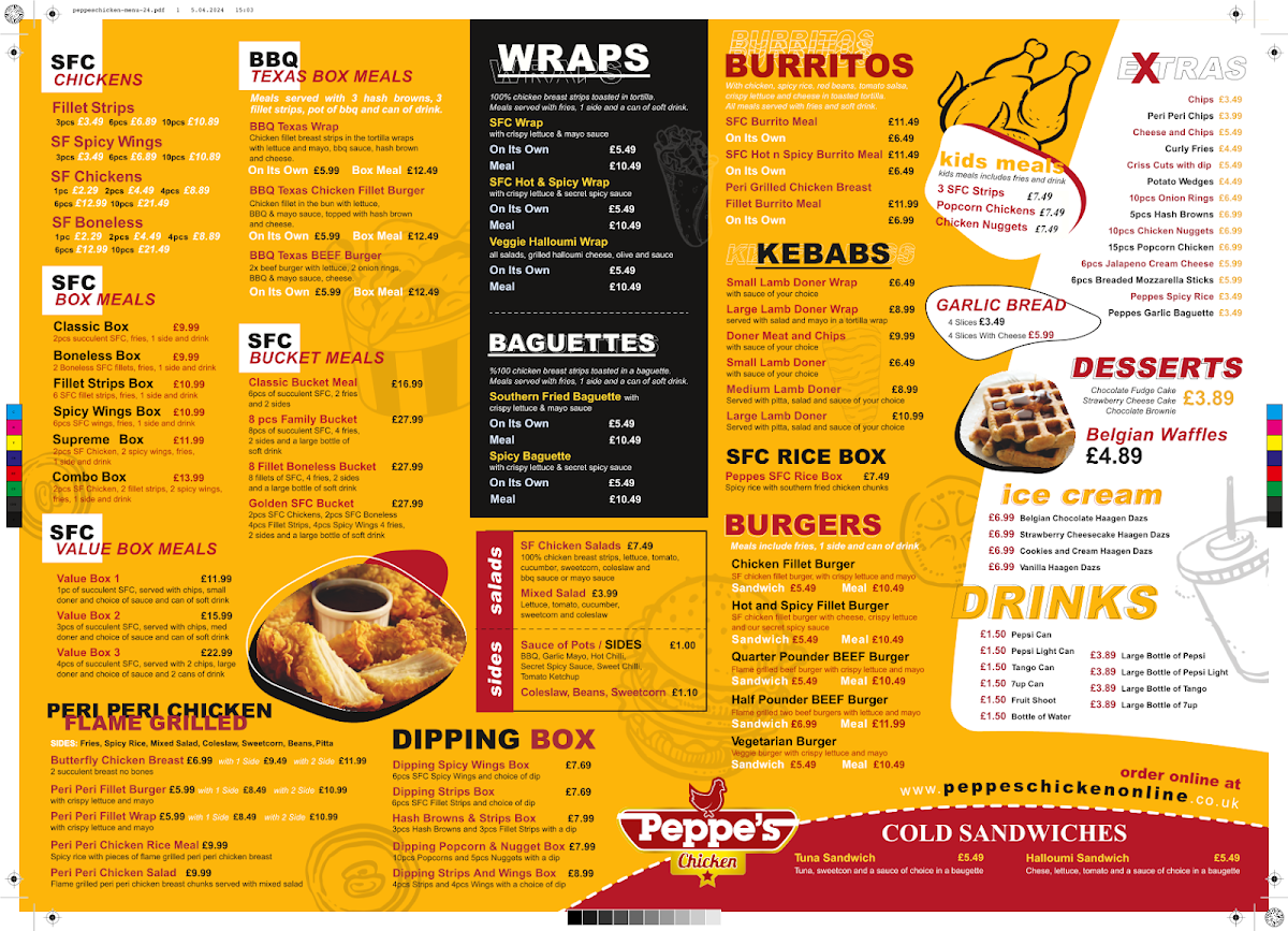 Peppes Chickens at 17 Nelson St, Market Harborough offers a menu that caters to both classic fried chicken lovers and those seeking something more adventurous. The SFC CHICKENS range, including 3 Pcs Fillet Strips, 6 Pcs Fillet Strips, 10 Pcs Fillet Strips, and individual pieces like 1 Pc Sf Chicken or 2 Pcs Sf Chicken, forms the heart of their menu, while the SFC BOX MEALS-from the Classic Box to the Supreme Box and Combo Box-offer hearty, all-in-one options. Wrap fans can enjoy the Sfc Wrap Sandwich or Sfc Hot And Spicy Wrap Meal, with veggie alternatives like the Veggie Halloumi Wrap Sandwich. The BBQ Texas Box Meals feature items such as Bbq Texas Fillet Burger Box Meal and standalone options like BBQ Texas FILLET Burger On Its Own. Burger lovers are treated to Fillet Burger Sandwich, Hot And Spicy Fillet Burger Meal, and Vegetarian Burger Sandwich. For those seeking Middle Eastern flavors, the KEBABS section includes Medium Lamb Doner, Large Doner Wrap, and Doner Meat And Chips. Burrito options like Sfc Burrito On Its Own or Grilled Chicken Breast Fillet Burrito Meal complement the menu, while baguettes such as Southern Fried Baguette Sandwich and Spicy Baguette Meal offer a lighter choice. Value seekers have Value Box 1, 2, and 3, while larger groups can opt for Classic Bucket Meal, 8 Pcs Family Bucket, or the Sfc Golden Bucket. Lighter and healthier options are represented by Peri Peri Flame Grilled dishes and salads, including Sf Chicken Salad With Mayo and Peri Peri Chickens Salad. Children are not forgotten, with meals like Kids 3 Sfc Strips Meal and Kids Popcorn Chicken Meal. Completing the offering are desserts such as Strawberry Cheese Cake, Chocolate Fudge Cake, and Warm Belgium Waffles, plus indulgent ice creams like Vanilla Haagen Dazs and Cookies And Cream Haagen Dazs. Extras include Chips, Curly Fries, 10 Pcs Onion Rings, and sides like Pot Of BBQ or Pot Of Sweet Chilli, while drinks range from Pepsi Can to Orange Fruit Shoot. Overall, the menu at Peppes Chickens provides a diverse mix of fried favorites, grilled options, wraps, burgers, and desserts, ensuring there’s something for every taste and appetite.
